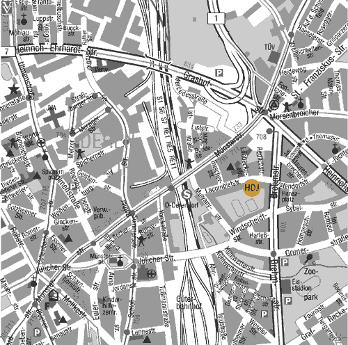 - mit den S-Bahnen S1, S6 oder S7 in Richtung Essen/Dortmund/Flughafen (Ausstieg Derendorf Bf) oder der Straßenbahn 708 in Richtung Mörsenbroich (Ausstieg Hansaplatz)