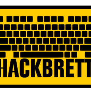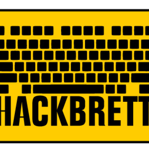 Schriftzug „Hackbrett“ und eine Laptoptastatur in schwarz auf gelbem Grund
